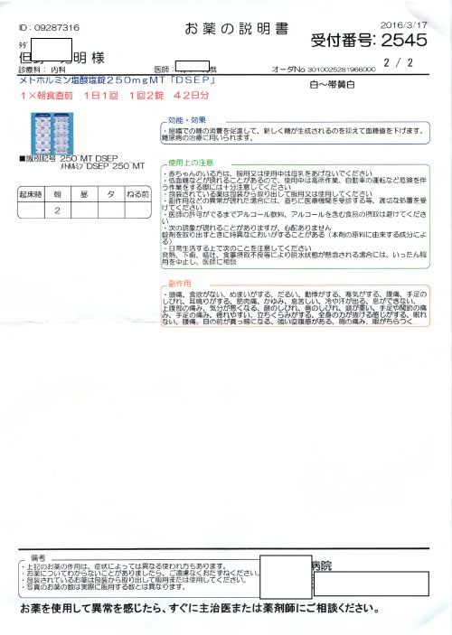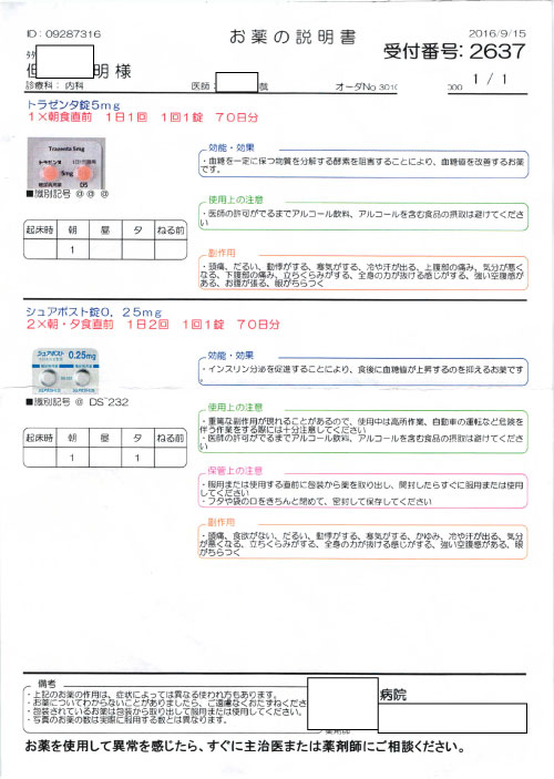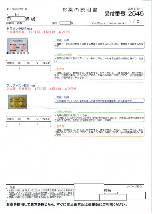 トラゼンタ 1錠、グルファスト 2錠、メトフェルミン 2錠((昼食時時々グルファスト 1錠